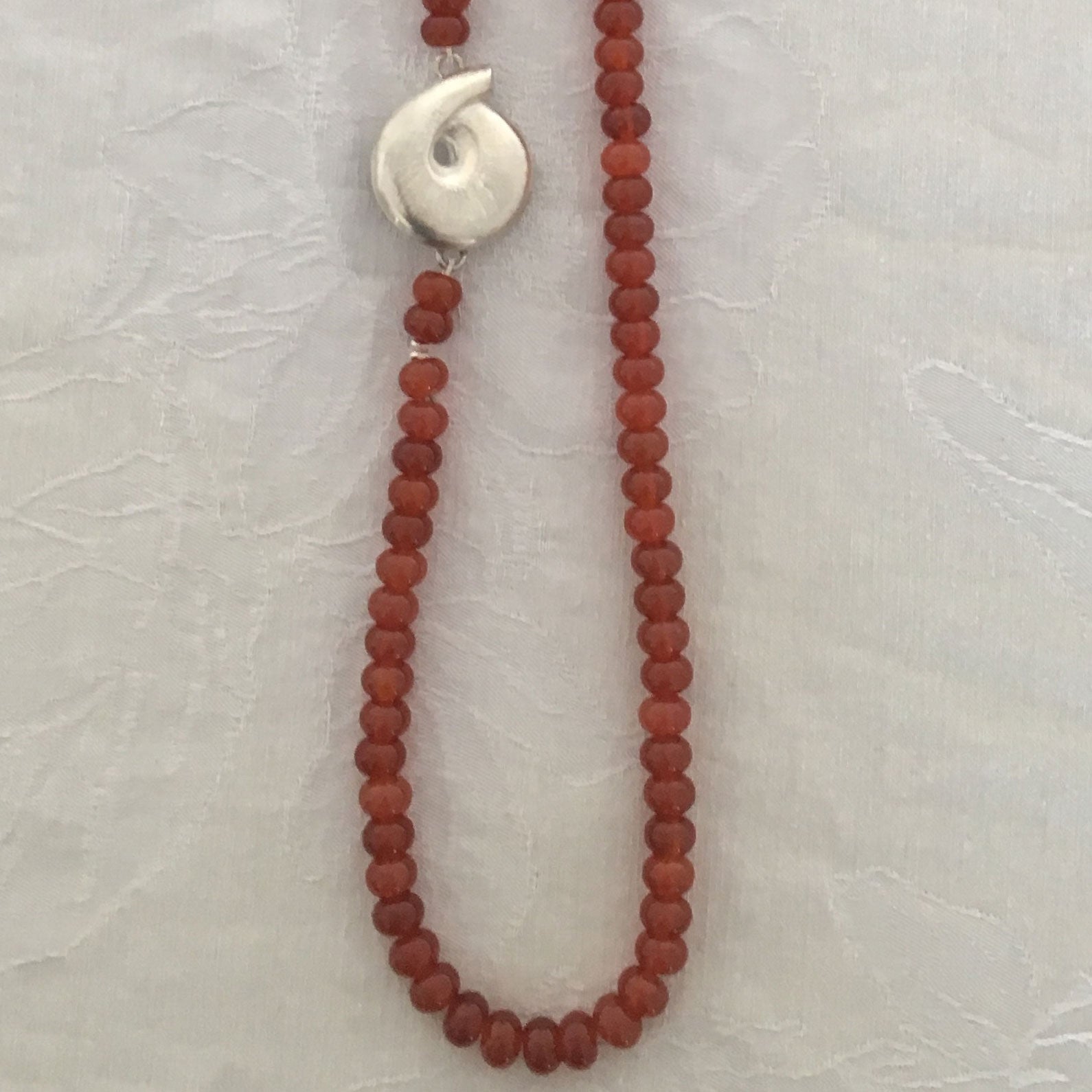 מחרוזת קרנליאן ותליון שבלול מכסף 925 (סטרלינג) חתום. שרשרת שזורה אבני קרנליאן עגולות אדומות ובשילוב תליון כסף יחודי בעיצוב שבלול. בעלת נוכחות חזקה ומרשימה במראה יוקרתי ומלא סטייל.