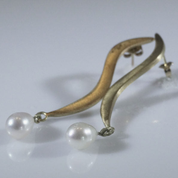 עגילי פנינה זהב צמודים בעיצוב S. עיצוב מיוחד עם נוכחות ורושם, בשילוב קלאסי של פנינים לבנות טבעיות וזהב 14K. מראה מחוספס וטבעי בשילוב יוקרה וסטייל ייחודי.
